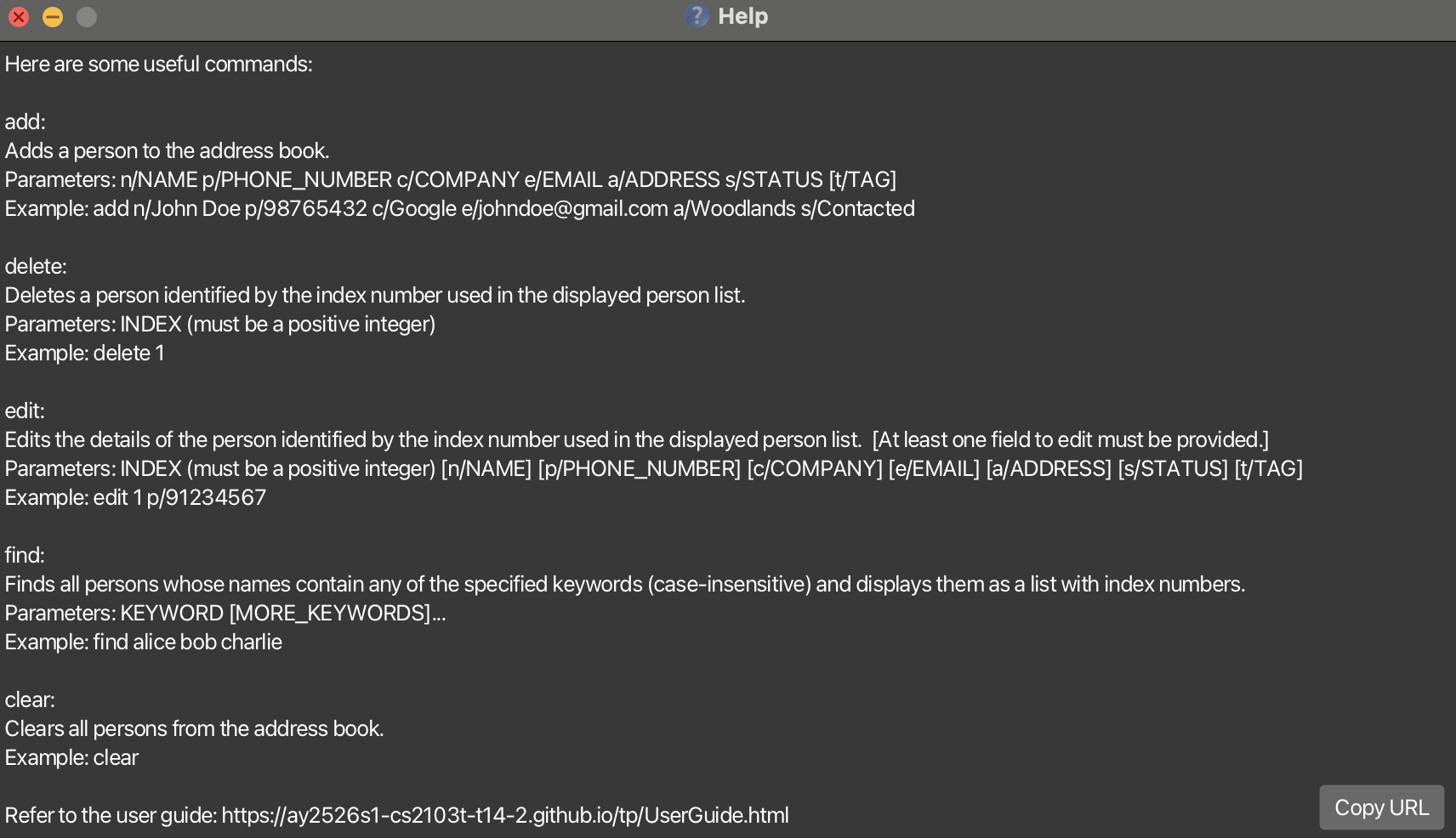 Edit | edit INDEX [n/NAME] [p/PHONE_NUMBER] [e/EMAIL] [a/ADDRESS] [t/TAG]… e.g., edit 2 n/James Lee e/jameslee@example.com |